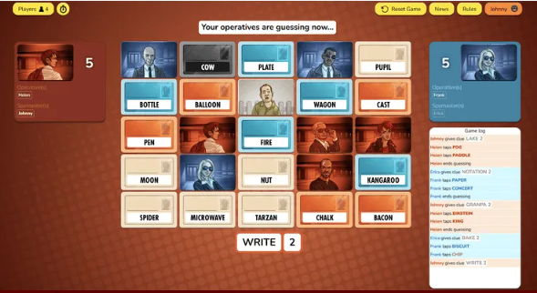 Spelet finns både som brädspel, app och online-spel. Vi spelar online-spelet som finns på www.codenames.game. Man behöver inte göra något konto, ladda ner eller installera något.