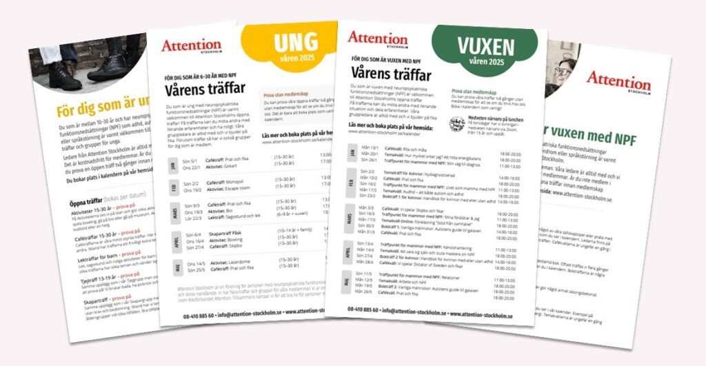Du kan prova våra träffar två gånger innan du bestämmer dig för medlemskap. För att delta i våra grupper behöver du vara medlem i Attention Stockholm.